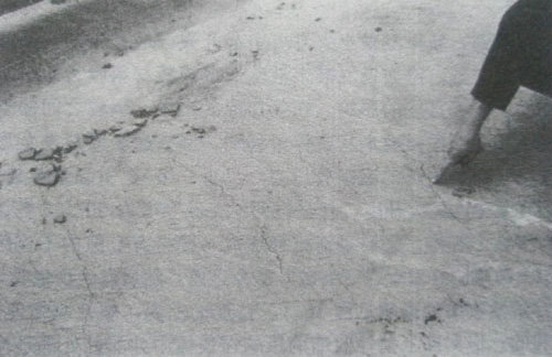 如圖-13示,某工地梁板結構的裂縫情況,當時天干風大,澆筑后未及時覆蓋,混凝土表面迅速失水開裂,當時混凝土并未初凝,但用壓抹的方法已無法使裂縫閉合,操作人員采用木榔頭敲砸的方法企圖使裂縫閉合,出現了圖示三種情況。由此可以看出,早期塑性裂縫在發現及時、處理得當的情況下,是可以避免的。