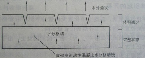 如果混凝土溫度比氣溫高(因陽光暴曬或其它原因,比如攪拌車到現場后,混凝土長時間不能澆灌入模,水化已經開始),即使氣溫涼爽且相對濕度為100%的飽和條件下,水分從混凝土表面蒸發的速率也相當可觀,因此,在涼爽、潮濕的氣候下混凝土也可能出現塑性裂縫。