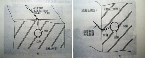 a)沿著鋼筋上表面發生裂縫 b) 沿著側面鋼筋而發生裂縫