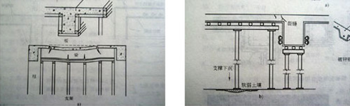 a)模板支撐下沉引起的開裂 b)模板支撐底部承載力差引起的下沉