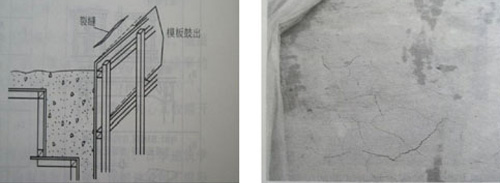 圖-6 模板側向變化引起的開裂 圖-7 混凝土淺表面的龜裂