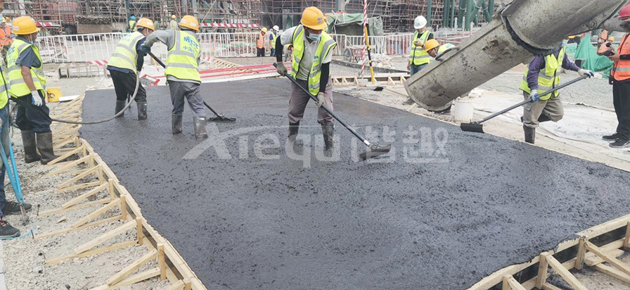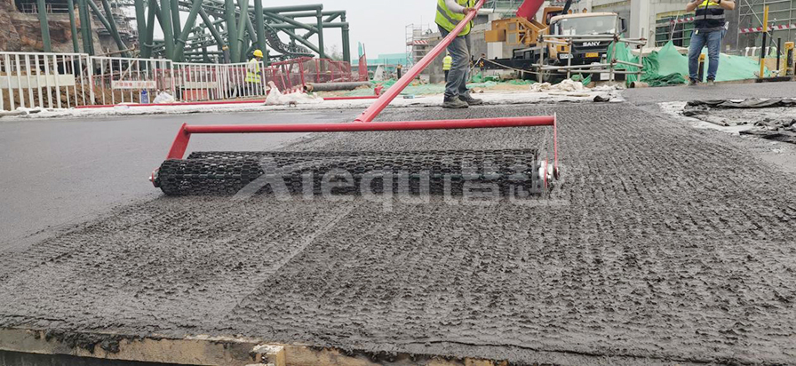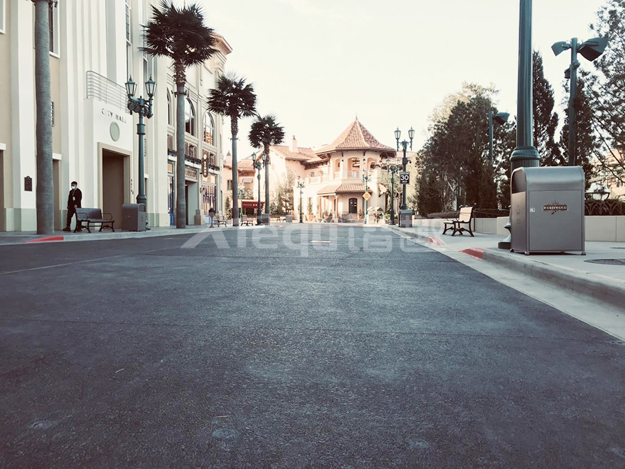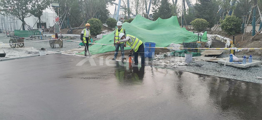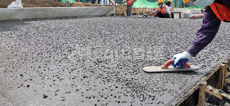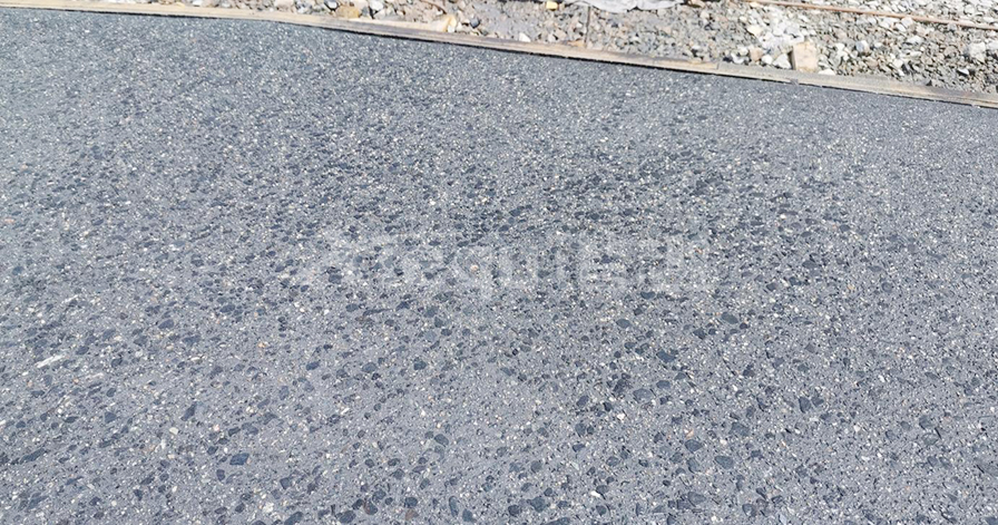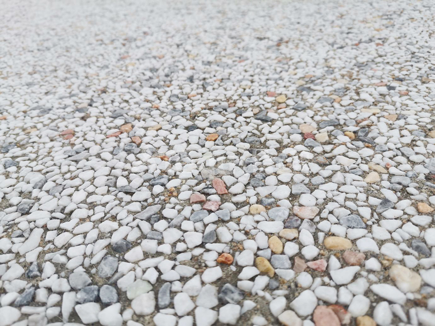 礫石聚合物藝術(shù)地面是在通體彩色混凝土初凝前合適的時(shí)機(jī)按照一定的比例要求將特殊骨料均勻的拋灑于彩混面層,再將骨料拍入面層后進(jìn)行收光,最后在面層均勻噴灑鈍化劑薄膜覆蓋,待混凝土固化到一定程度對(duì)表面進(jìn)行清洗露出骨料原貌的一種裝飾做法。